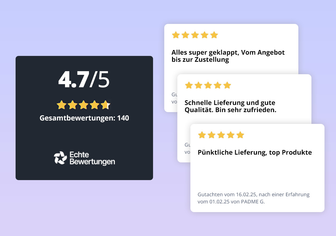 Weil Ihre Zufriedenheit für uns an erster Stelle steht, stellen wir Ihnen verifizierte Kundenbewertungen zur Verfügung, die Ihnen bei Ihrer Kaufentscheidung helfen.
