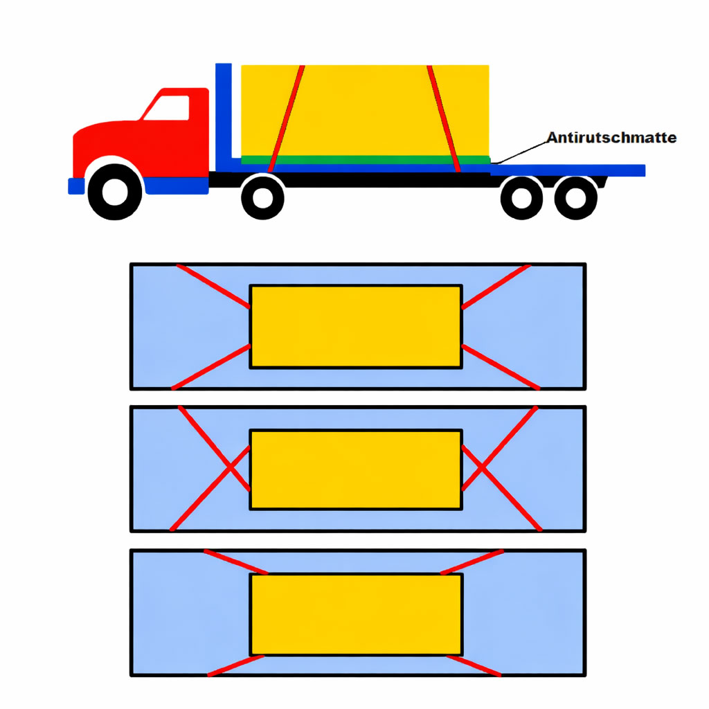 Zur formschlüssigen Ladung gehört aber auch, wenn das Ladegut auf der Ladefläche mithilfe von Zurrmitteln, Spanngurten oder Netzen an Ort und Stelle fixiert wird.